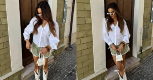 This champagne satin skirt with a white top is pure elegance! I’d rock it to a swanky steakhouse dinner. You can style it with a statement clutch and delicate heels to keep it luxe.
